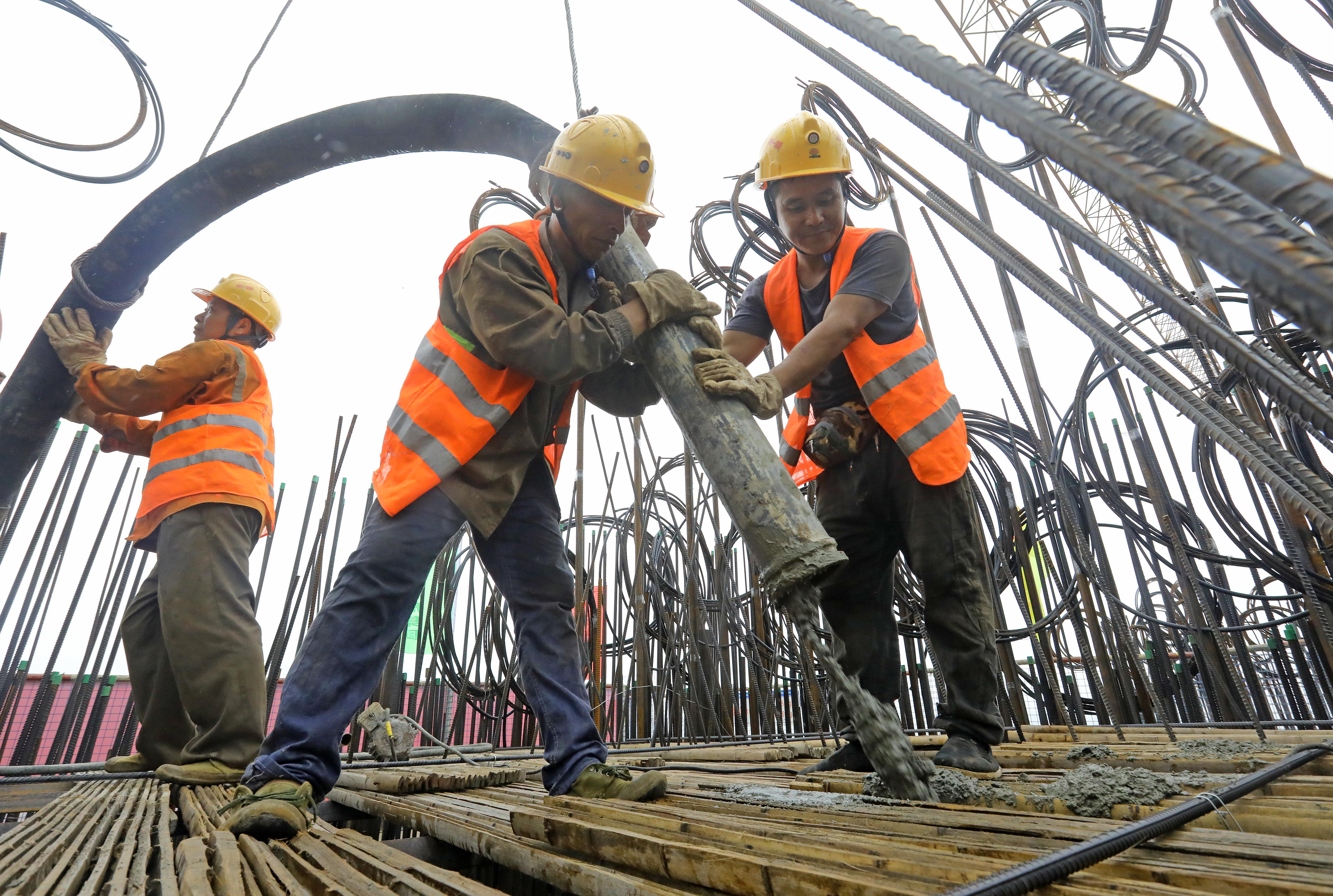 大桥建设者正在百米高空进行最后的混凝土浇筑。 记者 罗斌 摄/视觉重庆