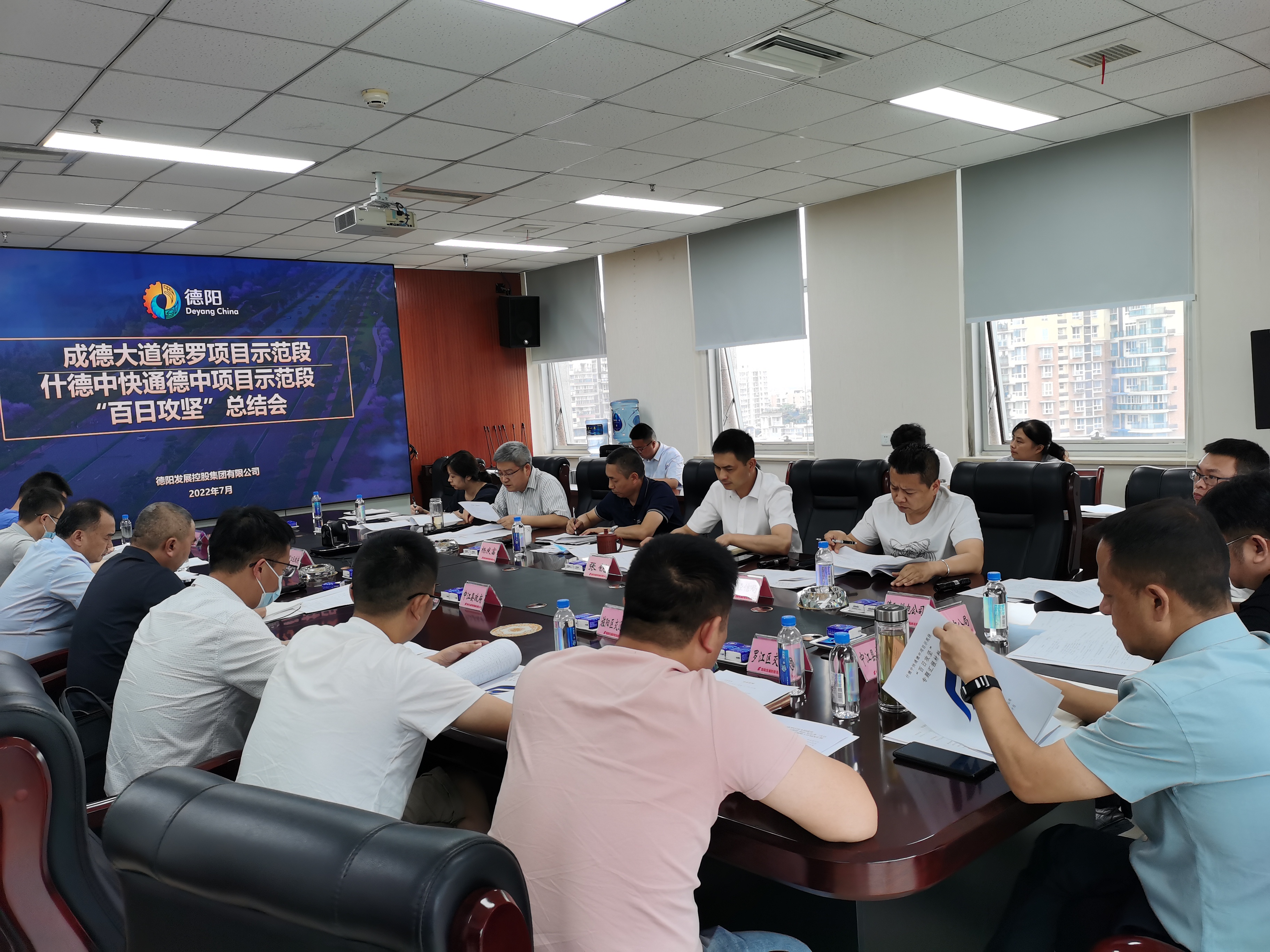 2022年7月18日下午,德阳市重大交通工程项目工作专班办公室在德阳发展集团9楼会议室召开德中、德罗项目“百日攻坚”活动总结会议。德阳市交通运输局、市经信局、德阳供电公司,旌阳区、罗江区及中江县政府分管负责人,经开区管委会相关负责人,旌阳区、罗江区、中江县交通局、旌阳区经信局,德阳发展集团、监理单位、施工单位主要负责人参会。