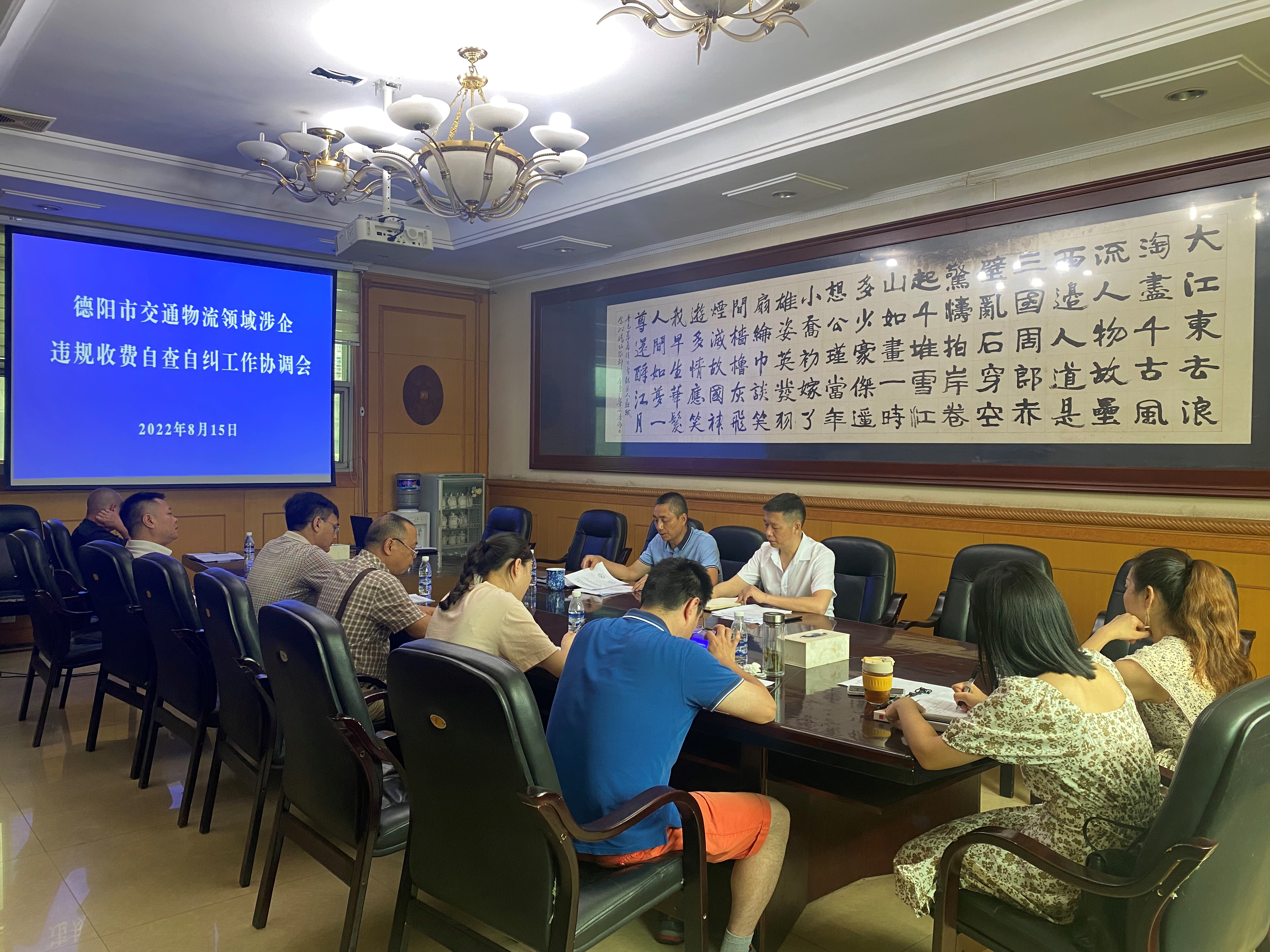 8月15日上午,德阳市交通运输局在局机关会议室召开德阳市交通物流领域涉企违规收费自查自纠工作协调会。会议由副局长杨庆富主持,办公室、行政审批服务科、财务科、安全运输科、路政管理科、机关纪委和市运管处、市海事局、综合执法支队、应急中心相关负责人参加会议。