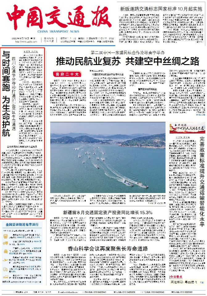 9月19日,中国交通报头版头条刊登厅宣传中心(中国交通报驻四川记者站)采写的稿件《与时间赛跑为生命护航四川交通争分夺秒打通泸定震区生命通道》。9月5日,一场6.8级地震突袭四川省甘孜藏族自治州泸定县,造成岩崩山摧、屋损路移。四川交通第一时间启动地震应急响应,成立抗震救灾前线、后方指挥部,实行两线作战,战山关、渡激流,越是艰险越向前。据悉,四川交通运输系统已开通高速公路“绿色通道”1397条,保障1.29万辆应急救援车辆免费快速通行,派出抢险救援队伍超1万人次,调派救援机具设备2566台班,累计出动客运车辆655辆次,运送7929人次,出动货车203辆次,运送救灾物资和防疫物资约2438.5吨。水路运输方面,已组织21艘船艇,累计转运被困群众、伤员和运送救援队伍总计6335人次,运送应急物资约43吨。(四川交通快讯)