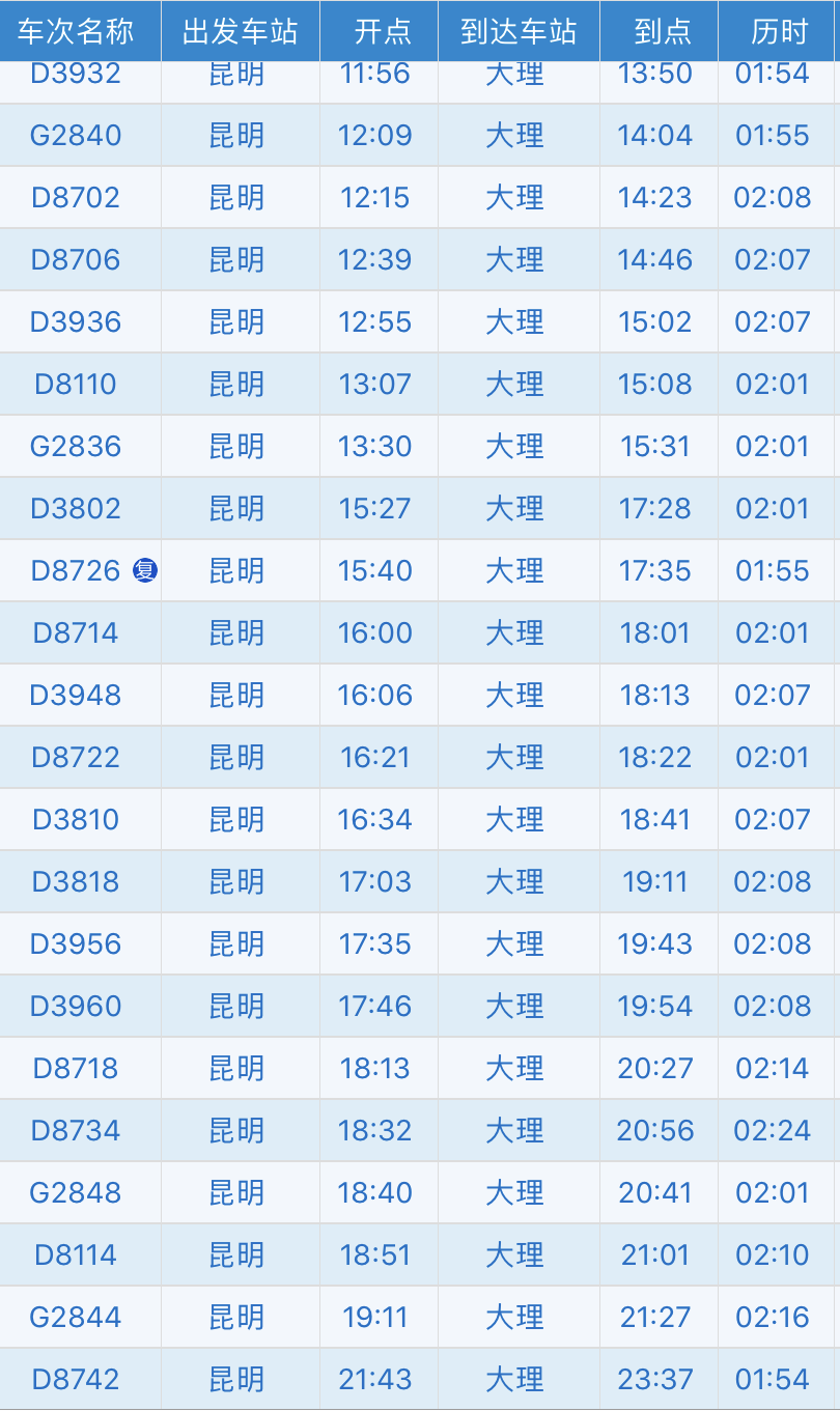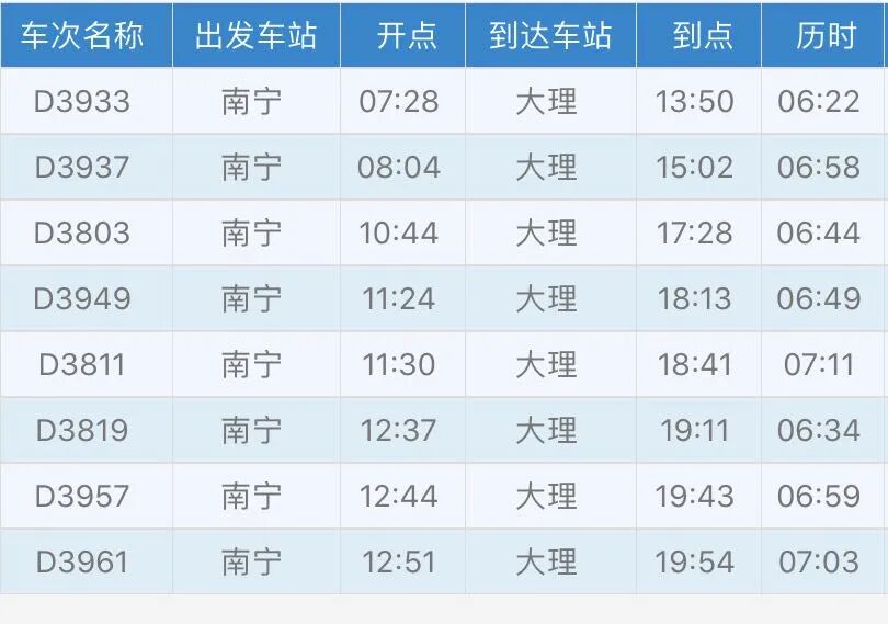 目前南宁出发,每日前往大理的直达动车组列车8趟,从南宁站或南宁东站出发皆可,出发时间集中在上午时段。如果上午赶不及,可以考虑先到昆明,再从昆明转车抵达大理。