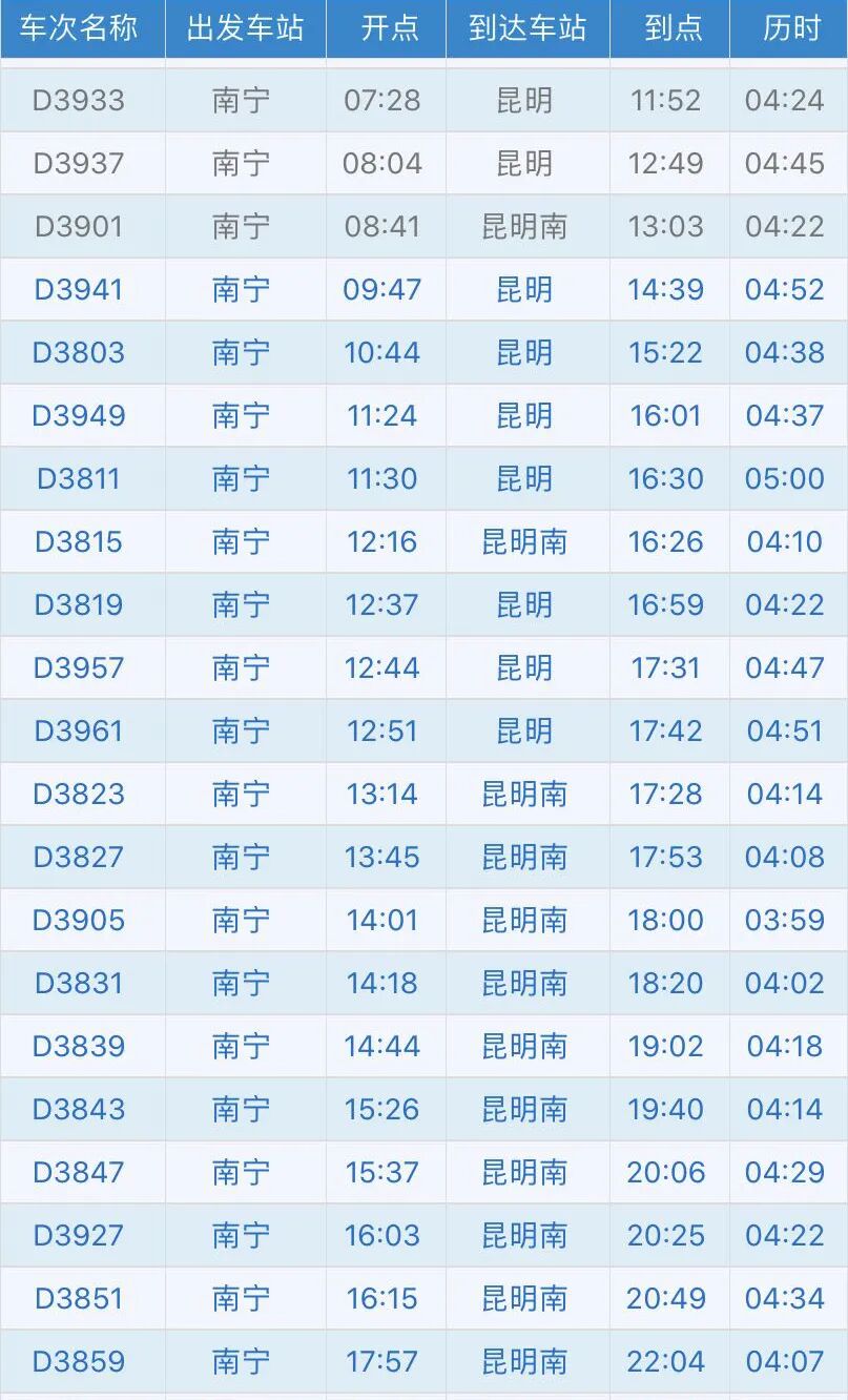 目前,从南宁每日开行前往昆明列车26趟,从南宁站或南宁东站出发皆可,昆明站、昆明南站均有到达,其中动车组列车22趟,普速列车4趟,动车开行时间在上午07:28至下午19:27,基本覆盖各时段,全程时长4-5个小时,基本可以满足大家不同行程需求。