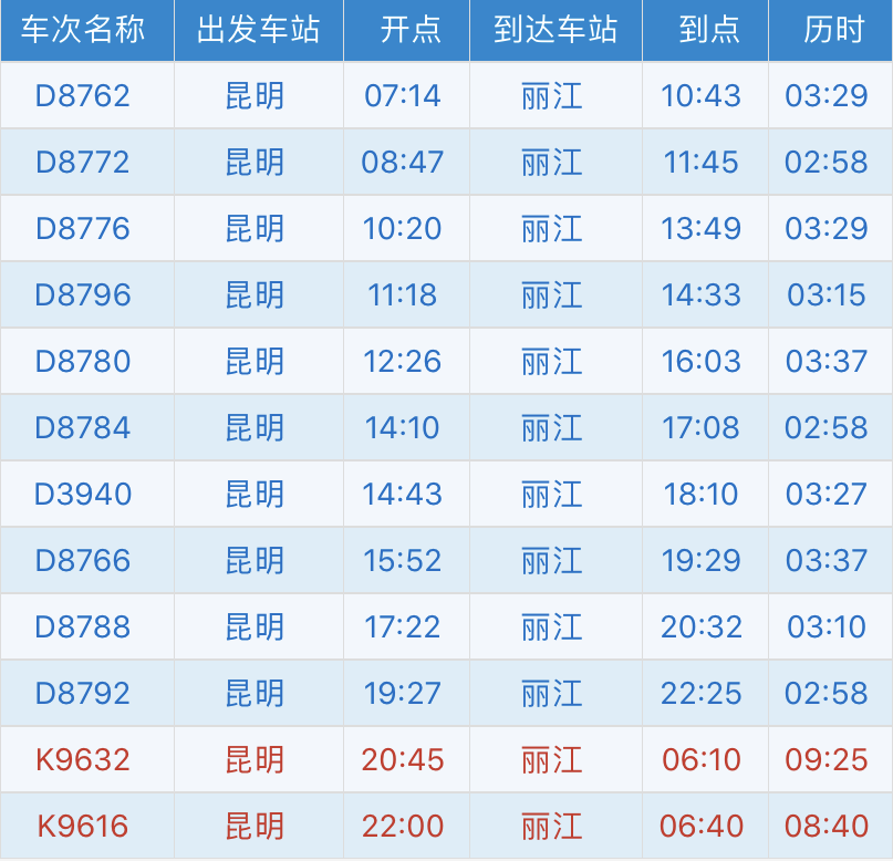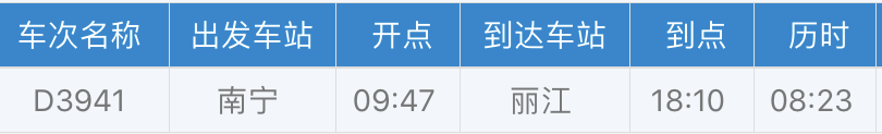 目前,南宁至丽江开行直达动车组1对,从南宁站或南宁东站出发皆可。
