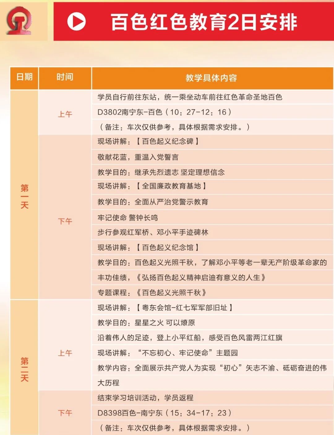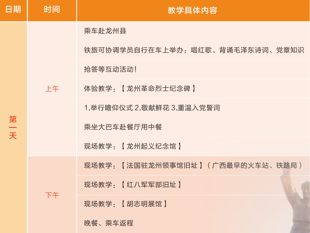 推荐线路1:龙州红色教育1日安排