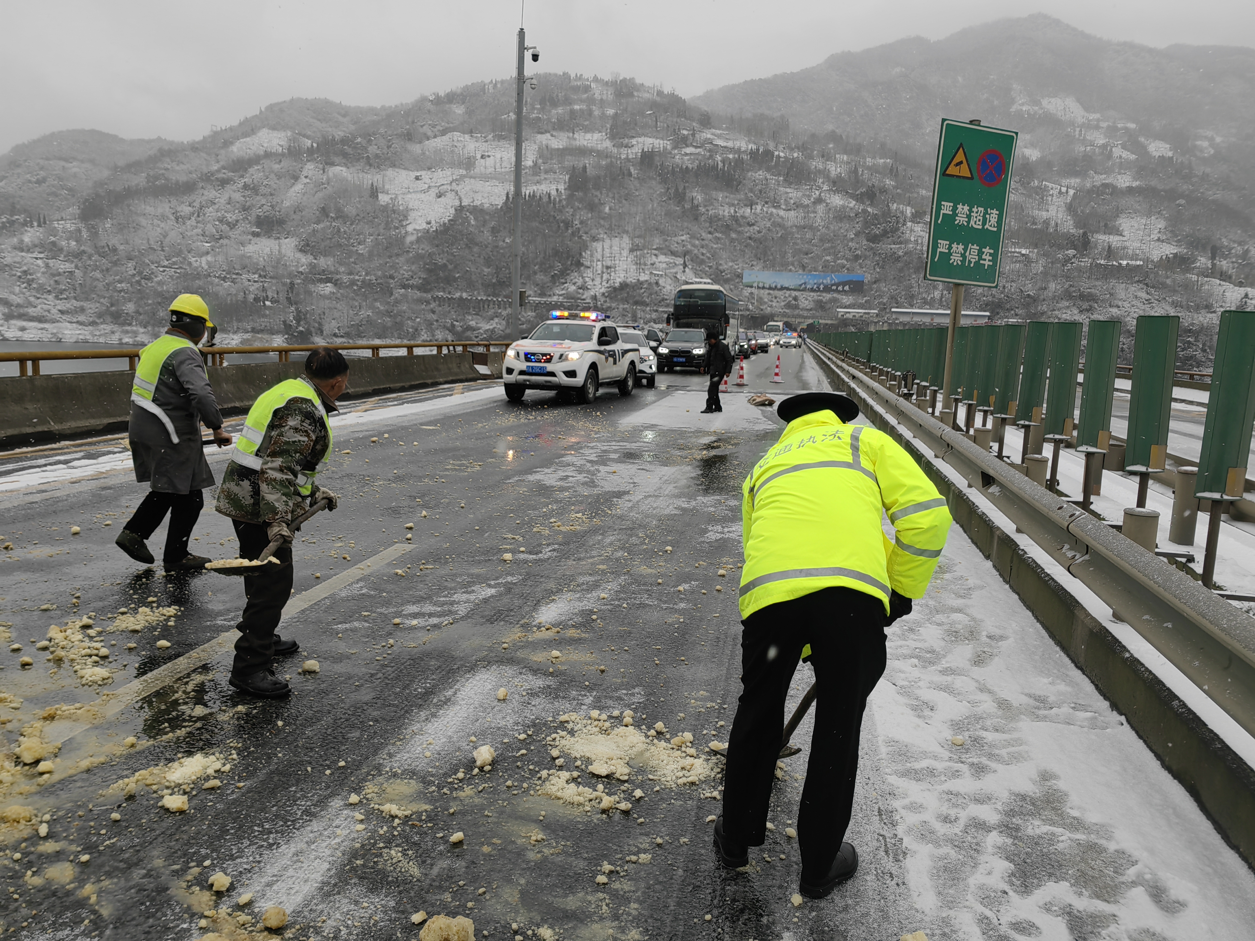 1月15日凌晨,四川境内出现大范围降雪,省交通执法总队(厅高管局)第一时间开展除雪融冰作业,缓解道路积雪结冰状况,最大限度恢复道路正常通行能力,并为滞留司乘人员免费提供开水、应急食品等。本轮抢通行动共计出动执法人员193人次,出动执法车辆85台次,撒融雪剂114吨,免费提供热水21220余升、发放方便面610余桶、面包690余个。经过近十余小时的持续抢通奋战,G5京昆高速雅泸段、G4217蓉昌高速都汶段、G76厦蓉高速钠黔段等已恢复通行。在此之前,在收到气象部门寒潮预警后省交通执法总队(厅高管局)便立即加强视频巡查频次,对重点路段、点位24小时动态监测,及时掌握路况信息,并及时向公众发布,有效引导出行,为应对冰雪天气做好了充分准备。截至15日15时,全省高速公路路网存在降雪情况但通行暂不受影响的有9处,不具备通行条件的有2处,目前省交通执法总队、高速公路营运公司等部门抢险人员依然奋战在抗冰雪保畅通一线,确保过往车辆通行安全。(四川交通快讯)
