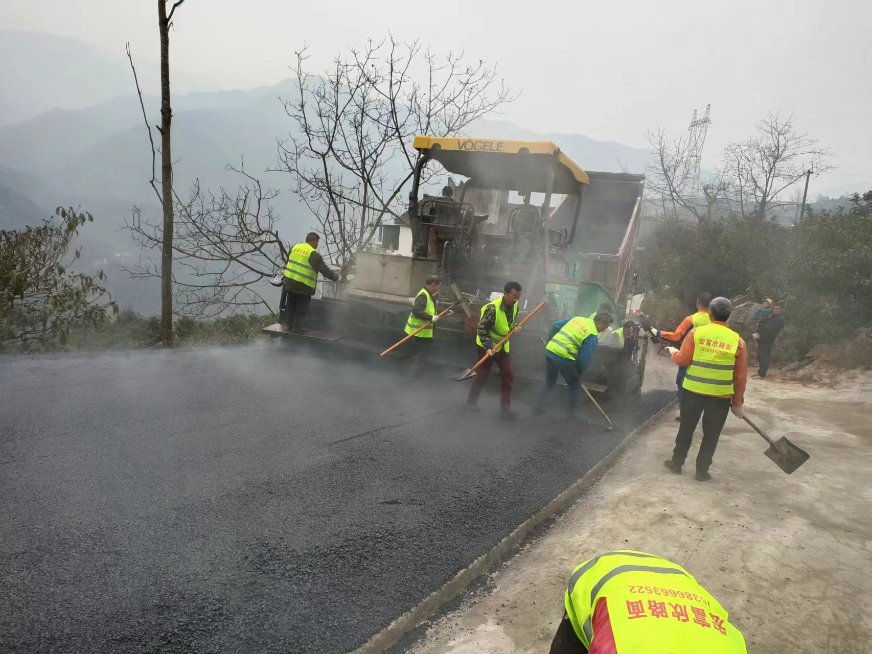 2月28日,伴随着机器的阵阵轰鸣声,在施工人员熟练的操作下,运料卡车、沥青摊铺机、压路机等工程机械协同作业,绵阳市曲山镇石椅村道路“黑化”工程进入最终零星铺设阶段。