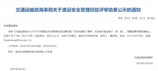 近日,交通运输部官方网站发布交通运输部海事局《关于渡运安全管理经验评审结果公示的通知》,我市沙湾区港航中心“渡运安全管理经验—乡镇船管站专人管理”通过部海事局评审。