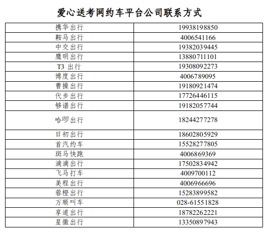 据了解,巡游出租车方面,即日起至6月5日晚21时,可通过关注成都市出租汽车协会微信公众号,填写姓名、住址、考场地址、免费送考时间、联系方式(考生或家长)等信息提交报名,另外也可以拨打95128免费约车服务热线报名。网约车方面,即日起至6月6日12时,可直接电话联系平台公司,提交姓名、住址、考场地址、免费送考时间、联系方式(考生或者家长)等基本信息进行报名,联系电话见下图。