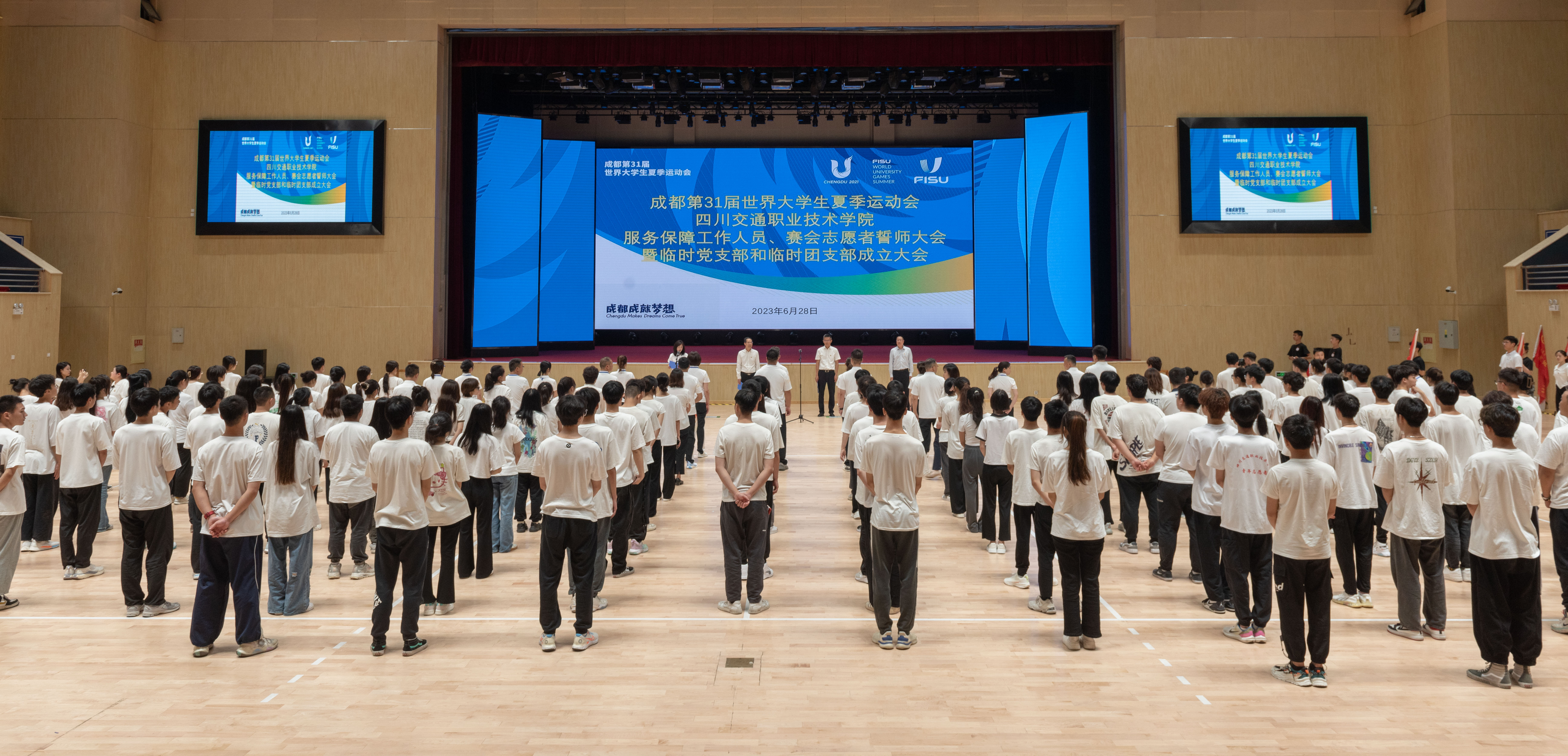 6月28日,在第31届世界大学生夏季运动会进入30天倒计时之际,交职学院举行成都大运会学院服务保障工作人员、赛会志愿者誓师大会暨临时党支部、临时团支部成立大会。大会向临时党支部和临时团支部授旗,学院所有服务保障工作人员和赛会志愿者庄严承诺:一定坚定使命必达的决心,坚决落实党中央、国务院决策部署和省委省政府、厅党组部署要求,不辱光荣使命;一定拿出舍我其谁的担当,积极弘扬志愿者精神,扎实有序做好服务保障和志愿服务工作,讲好中国故事,展现青春风采;一定树牢精益求精的匠心,认真学习大运知识,持续提升精准化、精细化服务水平,全面落实落细服务保障和志愿服务各领域各环节工作。(四川交通职业技术学院)
