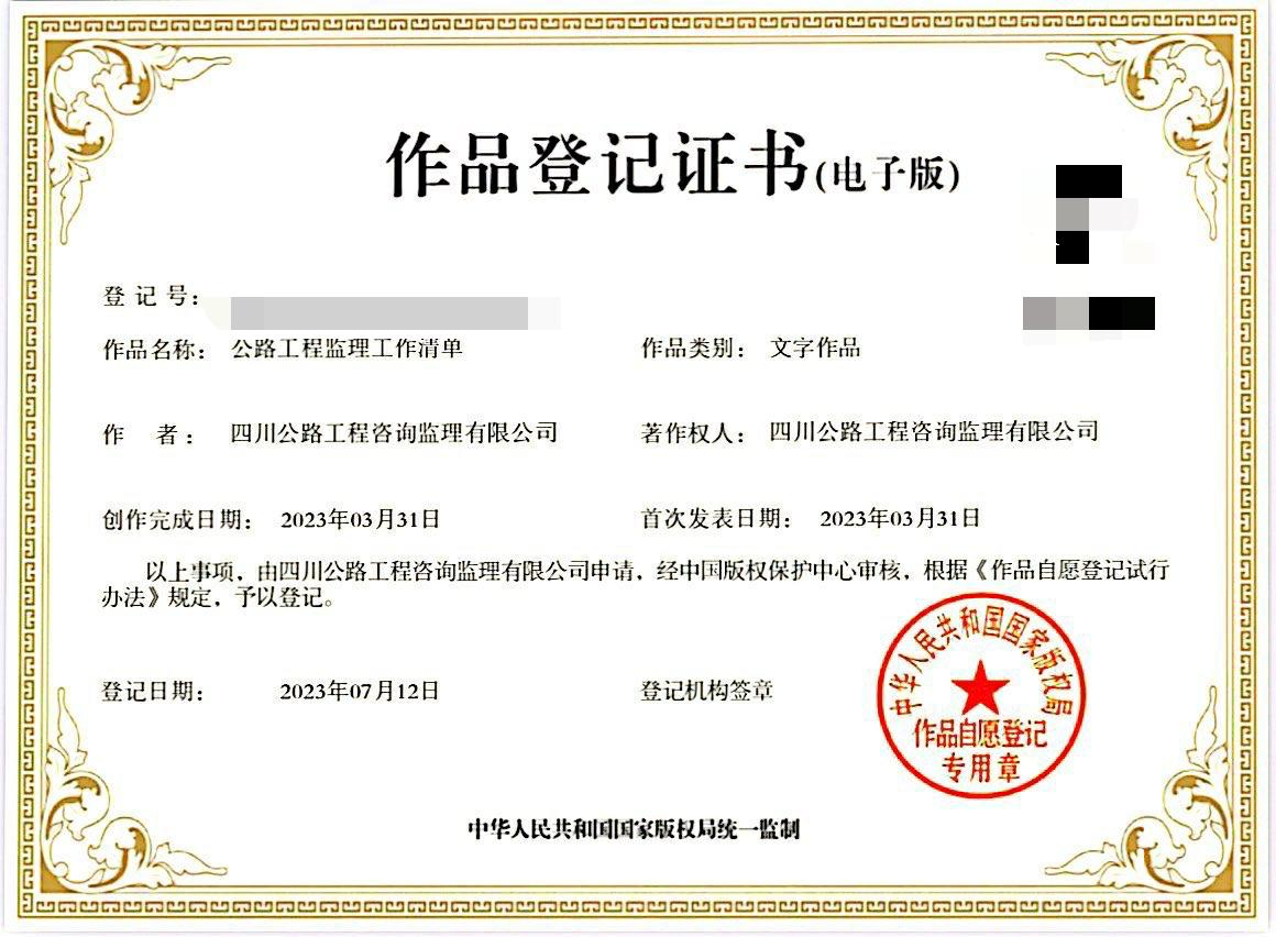 咨询监理公司编制的《公路工程监理工作清单》成功取得作品登记证书