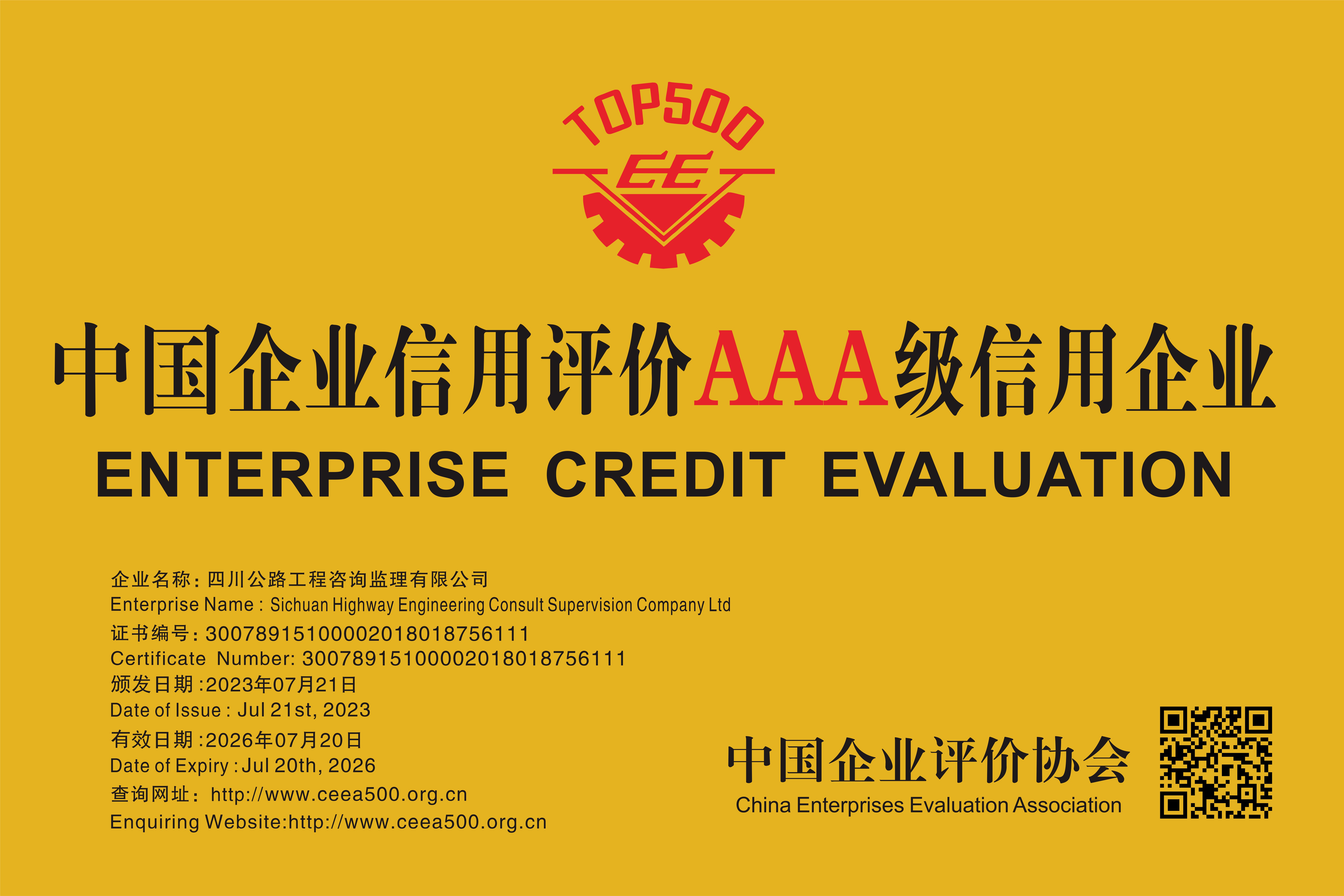 近日,咨询监理公司顺利通过中国企业评价协会组织开展的企业信用评价复评,再次被授予“企业信用评价AAA级信用企业”荣誉。