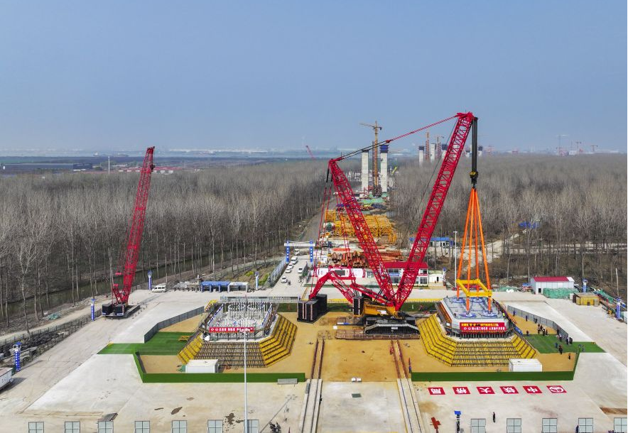 张靖皋长江大桥南航道桥北主塔塔柱首节段安装完成
