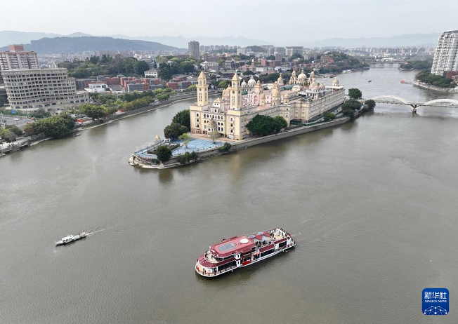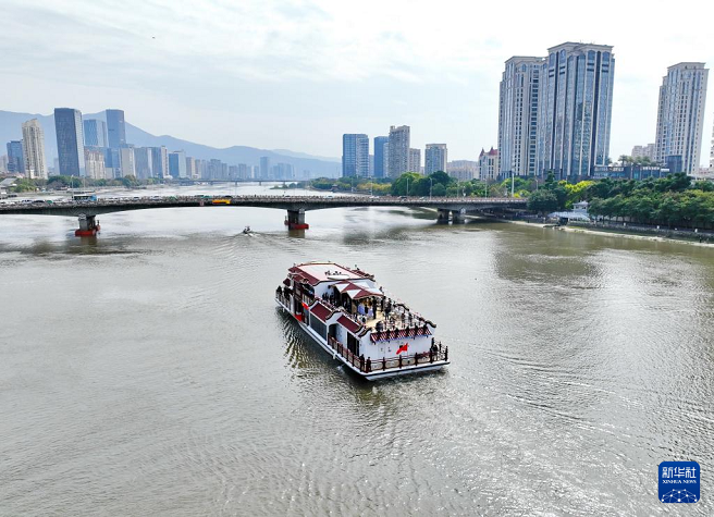 3月21日,“闽江会客厅”纯电动客船在闽江行驶(无人机照片)。