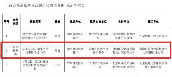 为总结推广各地公路危旧桥梁改造的成果经验和典型做法,促进提升公路危旧桥梁改造工作水平,近日,交通运输部公布了全国19个干线公路危旧桥梁改造工程典型案例。其中,益阳市公路建设养护中心组织实施的G207泗里河桥危旧桥改造工程入选组织管理类典型案例。