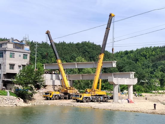 该项目处于G207交通主干道上,人流和车流量巨大,T梁长距离运输和安装施工过程中对正常交通造成一定影响,给交通和人流疏散带来压力。同时,考虑到征地拆迁、杆线迁移和河床地址条件,T梁采取吊装的方式安装,通过严格的计算,科学合理的制定吊装方案,有效的减少了房屋征拆、杆线迁移等工作量。桥梁人行道设置防撞钢护栏全面提高通行安全系数和人车分离方便度,坚持以群众需求和问题为导向,加强联动协作,逐步改善民众道路交通环境。