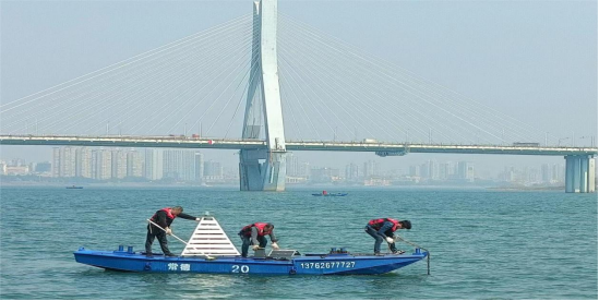 常德航道管理处工作人员针对桥区水位涨幅大、流速快、标志易流失等特性,为辖区桥梁水域航标增加钢丝进行固定,防止标志漂移。同时,工作人员24小时监控桥区航标,及时清除标链漂浮物,清洁标志,对航标电子设备进行检查保养,确保航标标位准确、颜色鲜明、灯光明亮、结构完整。