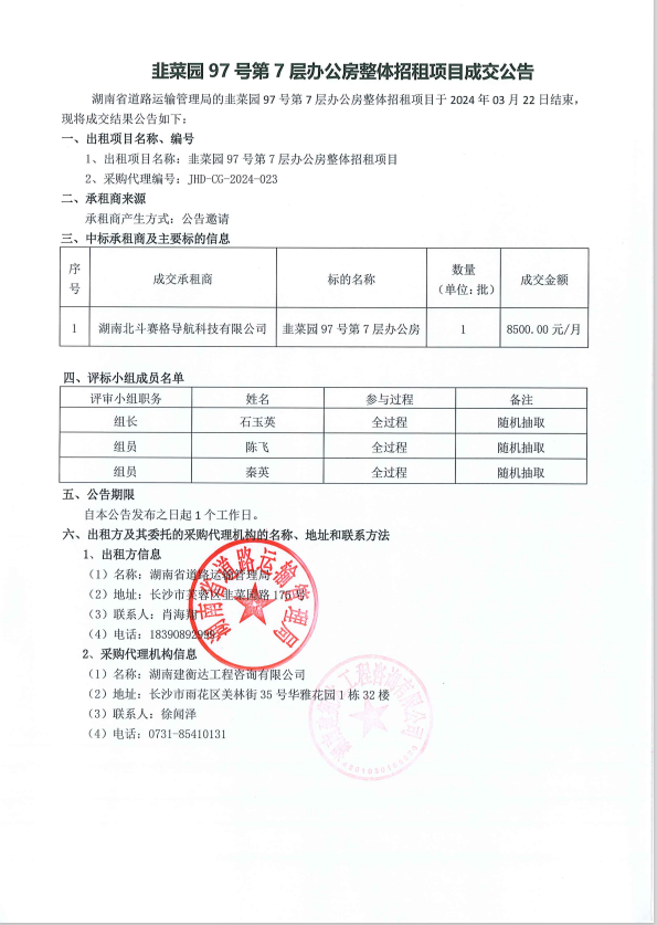 韭菜园97号第7层办公房整体招租项目成交公告