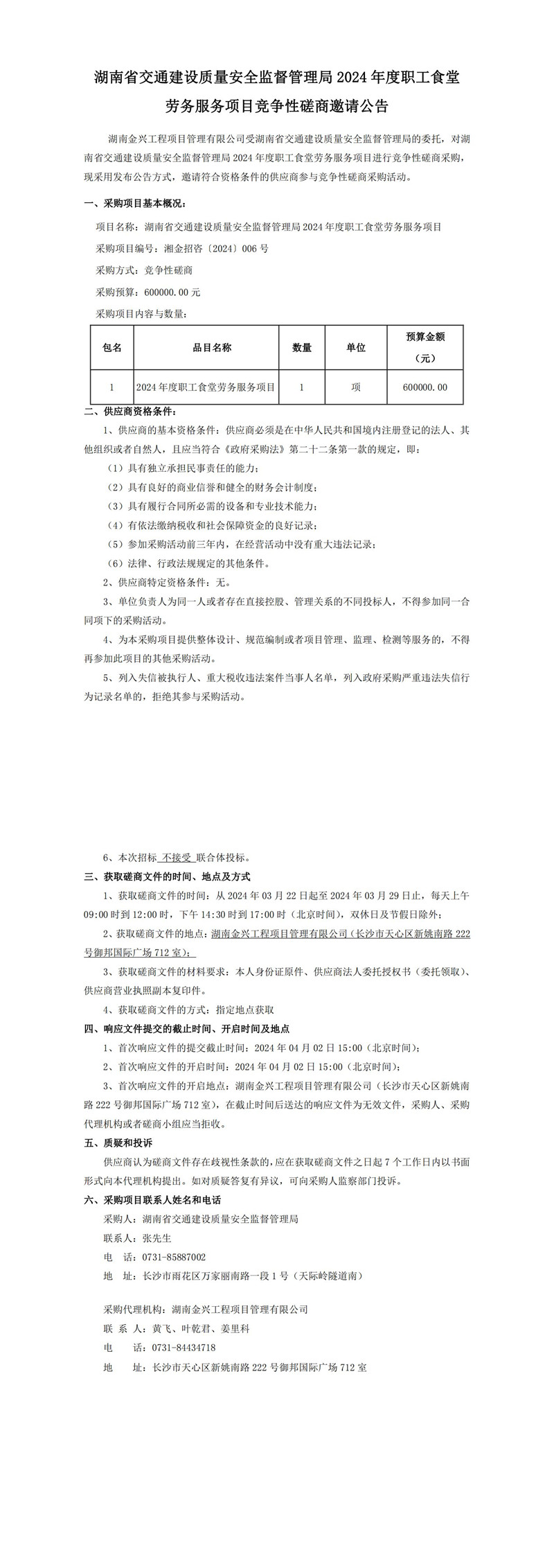 湖南省交通建设质量安全监督管理局2024年度职工食堂劳务服务项目竞争性磋商邀请公告