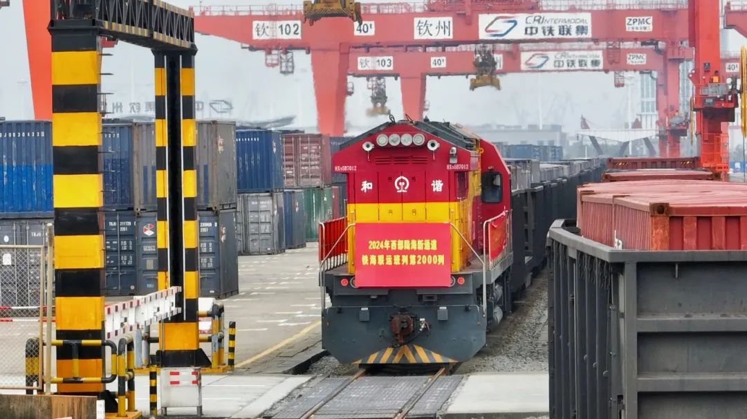 3月17日上午,一列满载缅甸黑芝麻、海南椰子汁、广西白糖等108个集装箱的海铁联运班列,从钦州铁路集装箱中心站缓缓发出驶向四川城厢站。这是2024年西部陆海新通道北部湾港海铁联运班列第2000列,同比增长16.8%,提前14天完成一季度班列开行任务,实现2024年首季“开门红”。