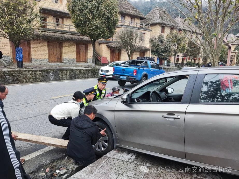元阳、红河大队帮助车辆重新踏上归途。2月10日,元阳、红河大队联合对景区路段重点巡查,在巡查过程中发现路边有两辆小型汽车陷入边沟无法驶出,驾驶人正在路边焦急地寻找救援,大队执法人员了解情况后积极动员周边群众参与救助,帮助车辆重新踏上归途。