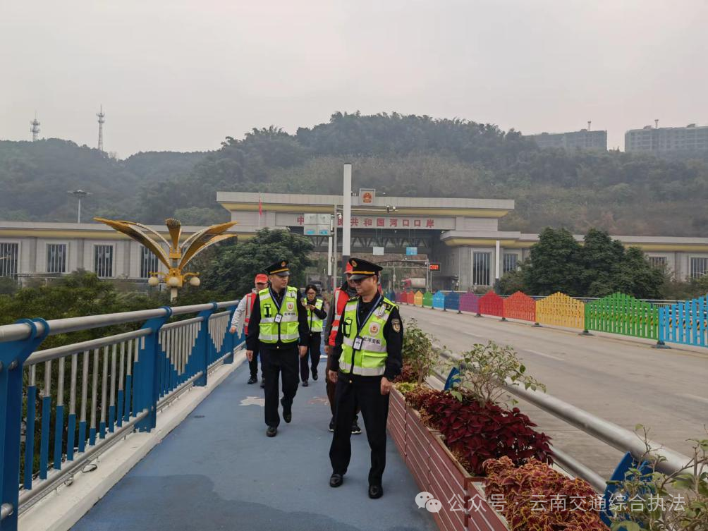 河口大队对跨境重要交通设施开展安全检查。今年春节,边境旅游热度不减,为实现跨境游和边境游高峰畅通出行,河口大队积极联系河口海关及河口公路分局桥梁管理所对中越红河公路大桥进行实地检查,确保人流和车流的平稳畅通,为中越跨国春节大联欢活动顺利举办做好保障。