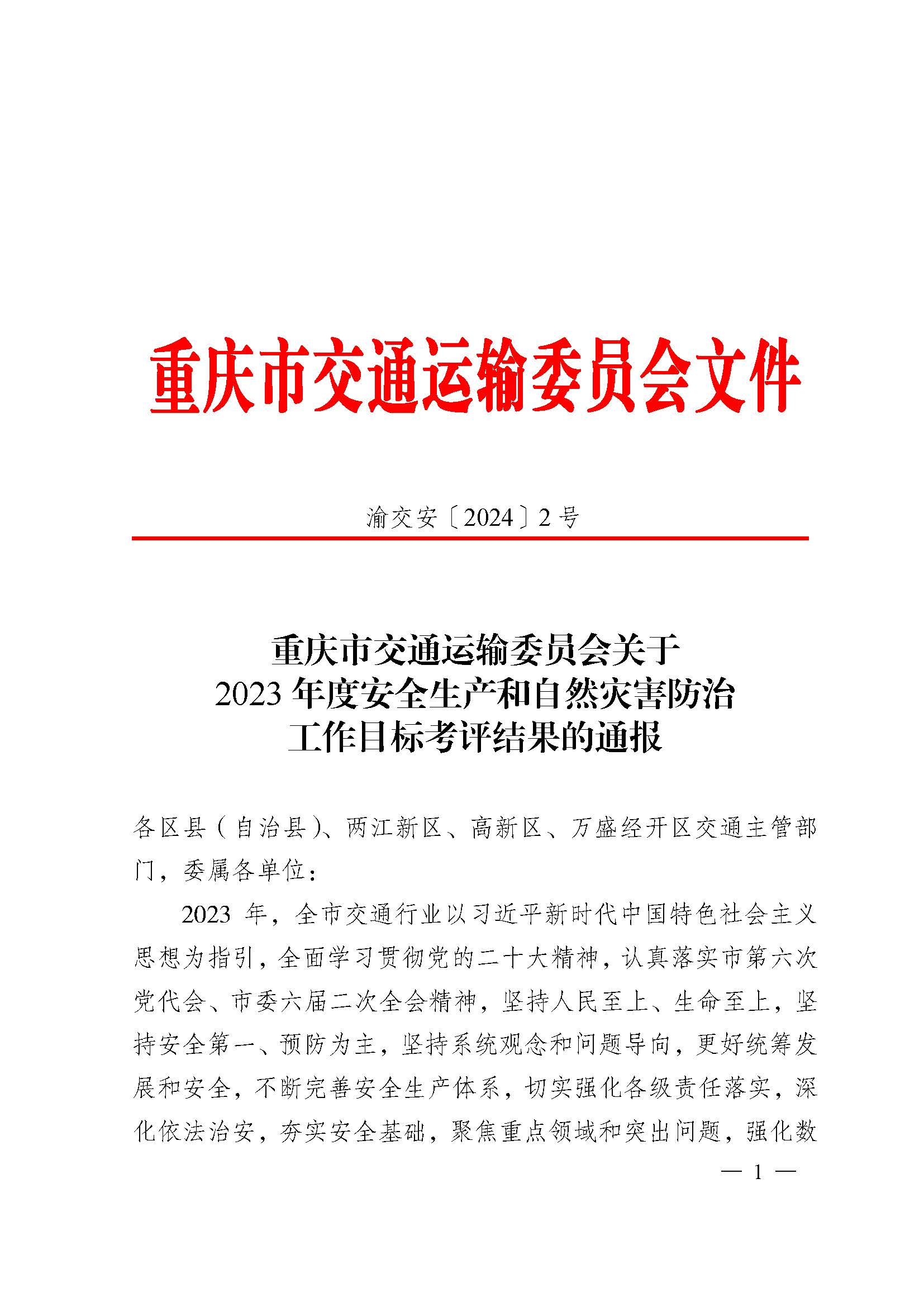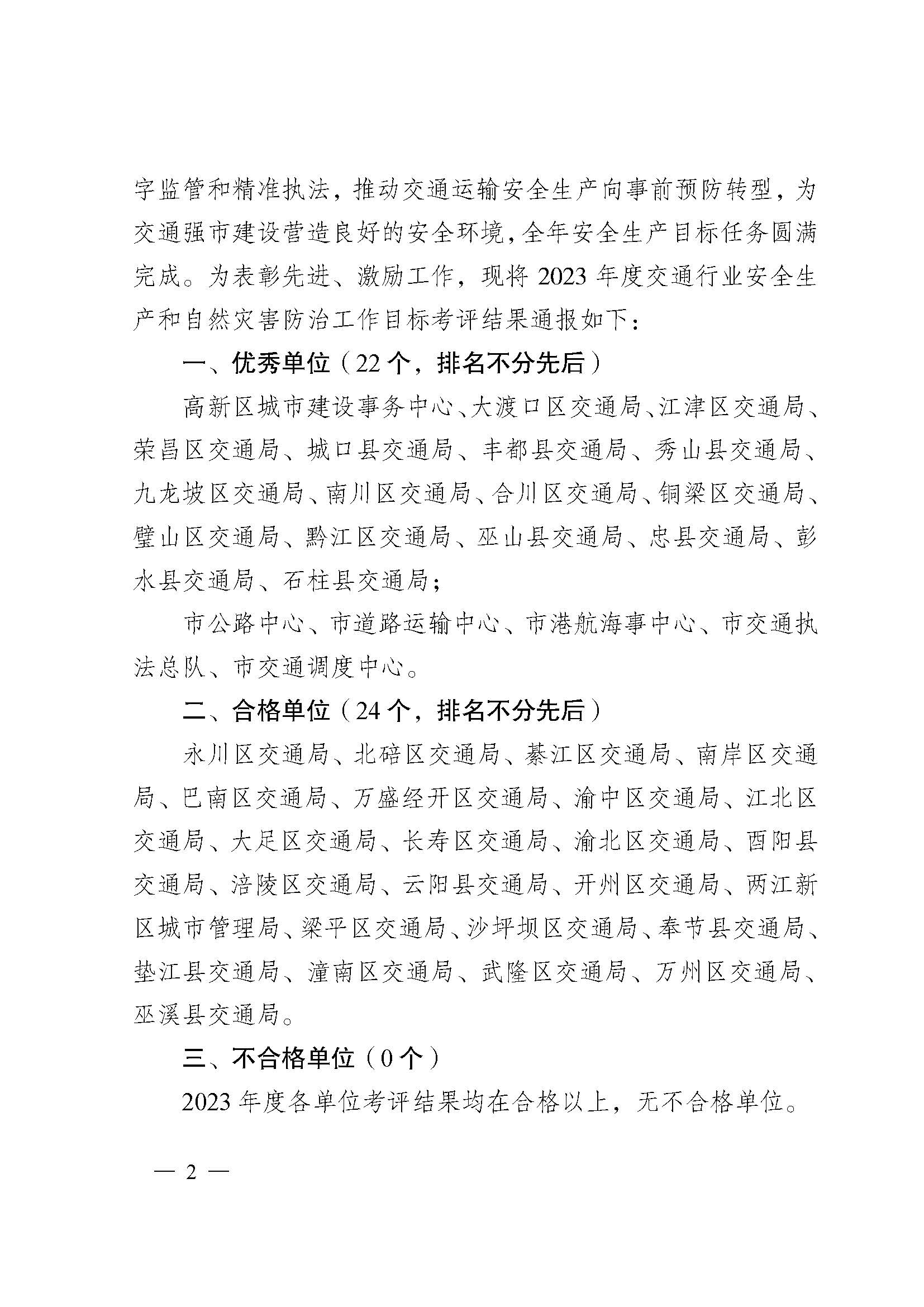 重庆市交通运输委员会关于2023年度安全生产和自然灾害防治工作目标考评结果的通报