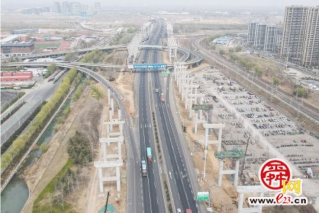 3月24日,在京台高速公路济南至齐河段改扩建项目施工现场,济南国际医学中心立交桥南侧的箱梁吊装工作已开始,立交桥南北两侧已建起高约30米的高架墩柱近百座,提前浇筑好的横梁吊装在墩柱上。京台高速公路拓宽的路段经过这里时,将整体抬高架设高架桥梁,桥下从南向北依次跨越小清河南路、小清河、京沪铁路等,为保障桥下的铁路通行安全,采用高架桥梁为列车通行留出足够空间。