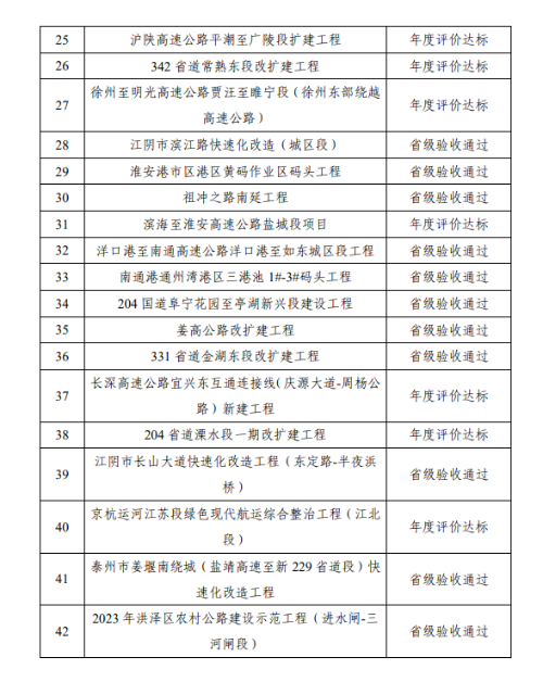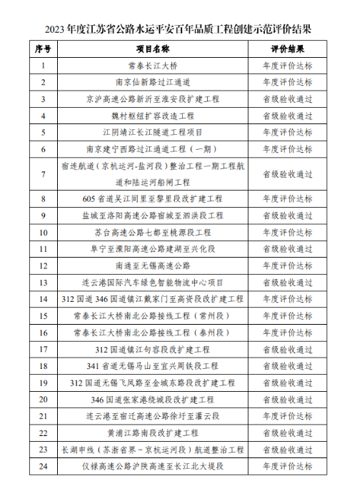 日前,省交通运输厅公布了2023年度公路水运平安百年品质工程创建示范省级评价结果,常泰长江大桥、南京仙新路过江通道工程、京沪高速公路新沂至淮安段扩建工程等42个创建示范项目年度达标/通过验收(具体情况附后)。
