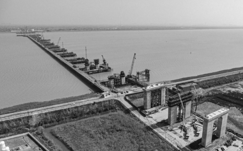 记者从中国铁路上海局集团有限公司获悉,3月27日12时58分,在启东长江入海口北支航道江面施工现场(如图),历经两天多的连续施工,崇启公铁长江大桥3、4号主墩承台首次浇筑完成,标志着大桥基础施工取得重大进展。