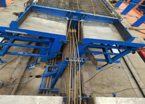 梁板装配化。本项目装配化桥梁梁板主要为预制T梁,预制T梁采用折线先张法施工,通过在张拉台座上安装转向器,预应力筋张拉过程中通过转向器进行转向、定位、弯折、成形,形成与其受力形式相适应的布置预应力筋方式,其弯矩图与荷载作用下的梁体受力弯矩图形状相近,克服了传统先张梁不能适用较大跨度的缺点,并找到了目前后张预应力混凝土孔道灌浆不密实、张拉端局压过大引起混凝土以及锚具破坏等技术难题的解决办法。
