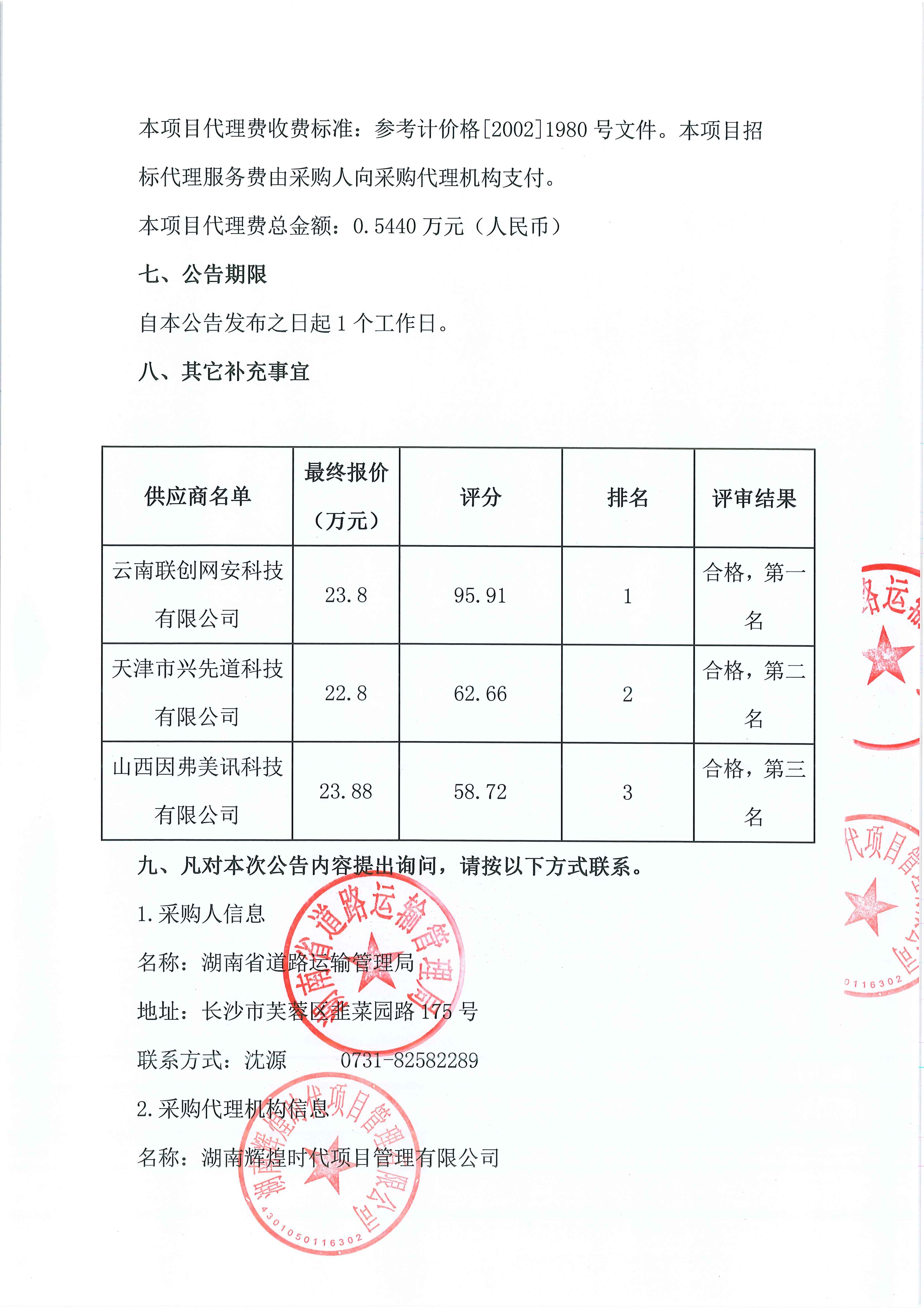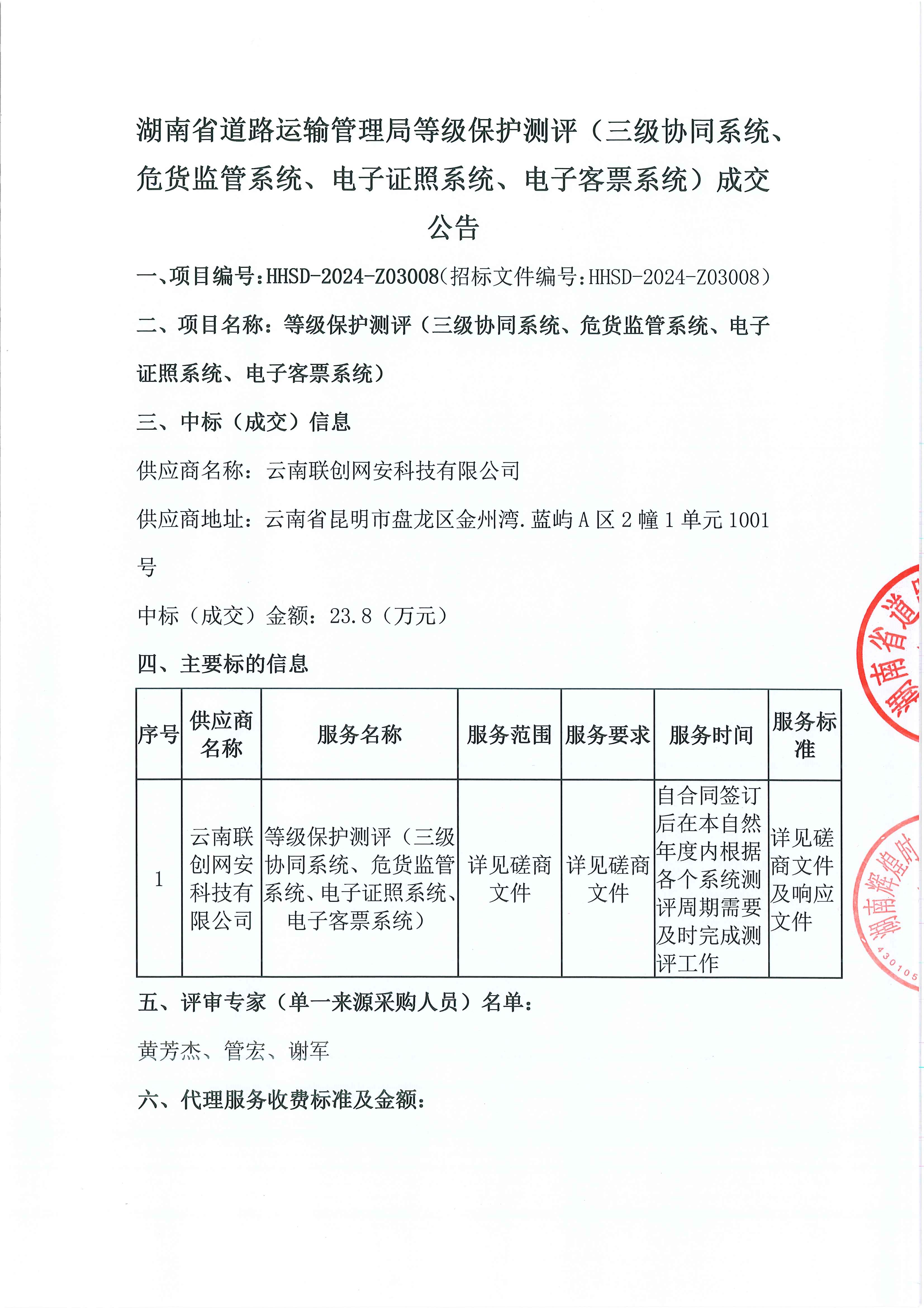 湖南省道路运输管理局等级保护测评(三级协同系统、危货监管系统、电子证照系统、电子客票系统)成交公告