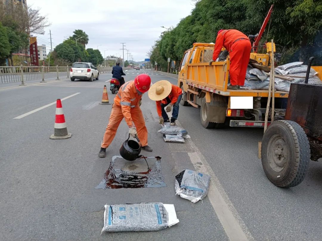 北流公路养护中心养护工人在国道324线K1419+800玉林市北流市路段修补路面病害。