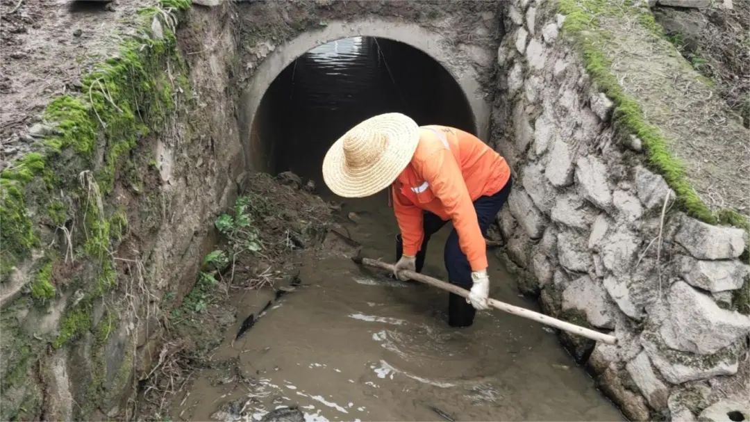 北流公路养护中心养护工人在国道241线呼和浩特至北海公路玉林市北流市塘岸镇路段清理涵洞淤泥。