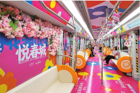 日前,昆明地铁4号线上新一列春日主题列车,车厢内用特色仿真花装饰,营造出浓厚的春日氛围,让市民和游客感受到“春城无处不飞花”的浪漫。