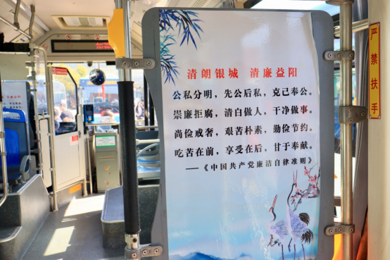 车身上“清朗银城清廉益阳加强廉洁文化建设营造崇廉尚廉氛围”的宣传标语在天蓝色的底色和亭亭玉立的荷花图案映衬下分外引人注目,喻意为“看取莲花净,应知不染心”。车厢上方看板中植入的中国共产党廉洁自律准则等内容,让乘客一走上公交车就有“清风扑面来”的感受。座椅靠背植入廉洁宣传标语和益阳名人胡林翼、陶澍、周立波家规家训等廉洁内容和小故事,并配有二维码,乘客只需扫描二维码,便可轻松进入“廉世界”,充分发挥廉洁公交寓廉于“乘”、富教于“行”的作用,让乘客在坐车闲暇时在潜移默化中受到廉洁文化的熏陶。