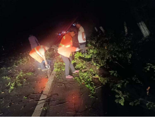 险情就是命令,当天晚边7点左右公路部门接到报险后,公路建设养护中心立即组织人员前往清障,迅速在倒树两端设置安全标志牌,防止途径车辆因雨天看不清楚出现的险情,一边勘察现场对倒伏在公路上的行道树进行清除。由于夜间天黑无路灯,应急人员按照既定应急方案,将车灯当路灯,一些人手拿电筒,一些人手握电锯,顶风冒雨,先将倒伏的树木锯断,然后再徒手逐一将树干、树枝推至路边,将倒伏的指示牌扶正,经过两个小时清理,最终打开通道。截至目前,倒伏在公路上的树木全部清除,路面恢复畅通。