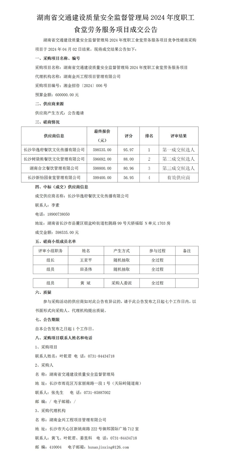 湖南省交通建设质量安全监督管理局2024年度职工食堂劳务服务项目成交公告