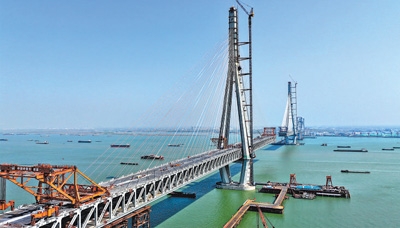 江苏常泰长江大桥是长江经济带综合立体交通走廊的重要项目,也是世界首座集高速公路、城际铁路和普通公路为一体的过江通道。建成通车后,泰州与常州之间公路通行仅需20分钟。图为3月24日,进入全桥合龙冲刺阶段的常泰长江大桥。