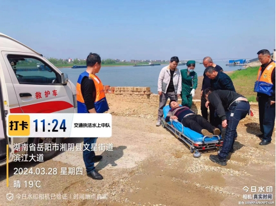 救援快艇到达永州9号船附近后,执法队员与船员一起将病人通过快艇护送上救护车。目前病人正在湘阴县人民医院住院治疗,情况稳定。