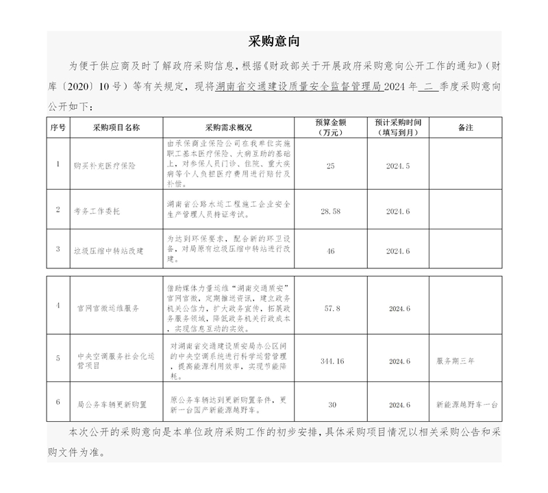 湖南省交通建设质量安全监督管理局2024年二季度采购意向