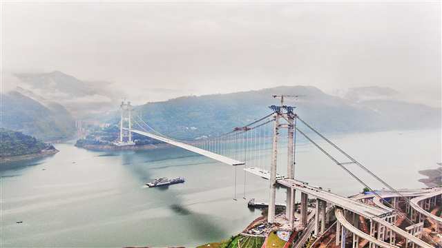 长江上游最大跨径钢箱梁悬索桥 江龙高速复兴长江大桥主跨合龙