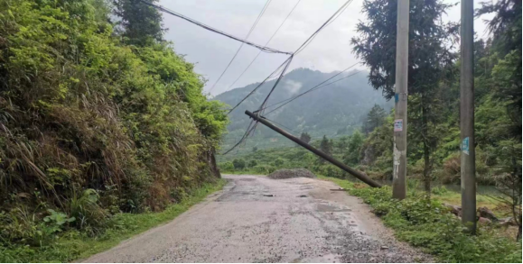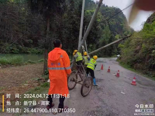 4月12日,连降暴雨,新宁县公路建设养护中心安全应急人员在巡查当中发现省道S341线水庙至麻林段一处路基有电信线杆受强降雨影响倾倒,存在重大行车安全隐患,需要紧急处置。