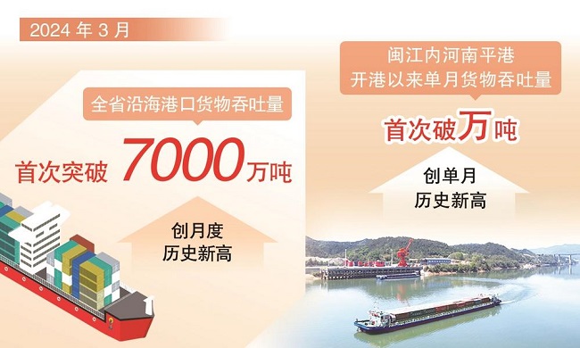 (记者 张颖 通讯员 薛荣泰 陈娜妍) 记者从省交通运输厅获悉,一季度我省港口发展多项指标亮眼:3月全省沿海港口货物吞吐量完成7051.48万吨,同比增长6.2%,单月吞吐量首次突破7000万吨,创月度吞吐量历史新高;闽江内河南平港货物吞吐量完成12009吨,开港以来单月吞吐量首次突破万吨,创单月历史新高。