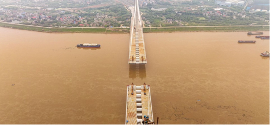 4月11日,随着主桥第45节钢箱梁完成吊装,杨梅洲大桥主体合龙进度已完成85%,距最终合龙仅差111.8米。