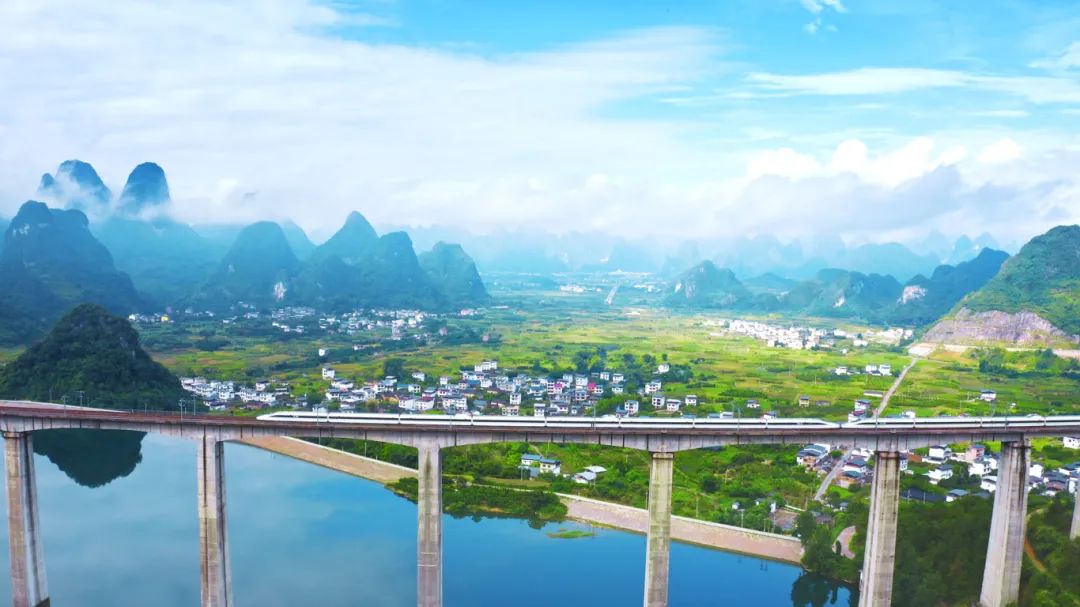 动车驶过贵广高铁桂林至阳朔区间的幸福源水库双线特大桥。(秦昱翔 摄)