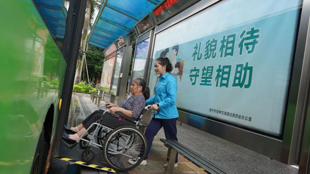 工作人员协助乘坐轮椅乘客上车。(南宁邕城公共交通有限公司 供图)