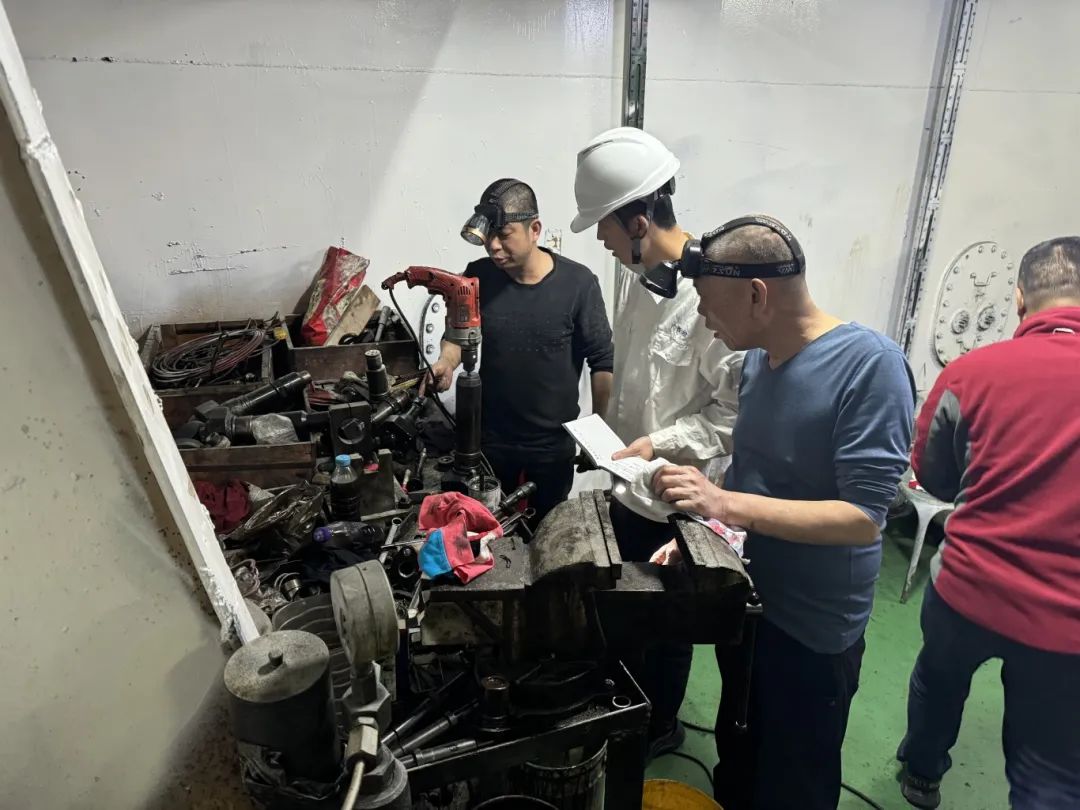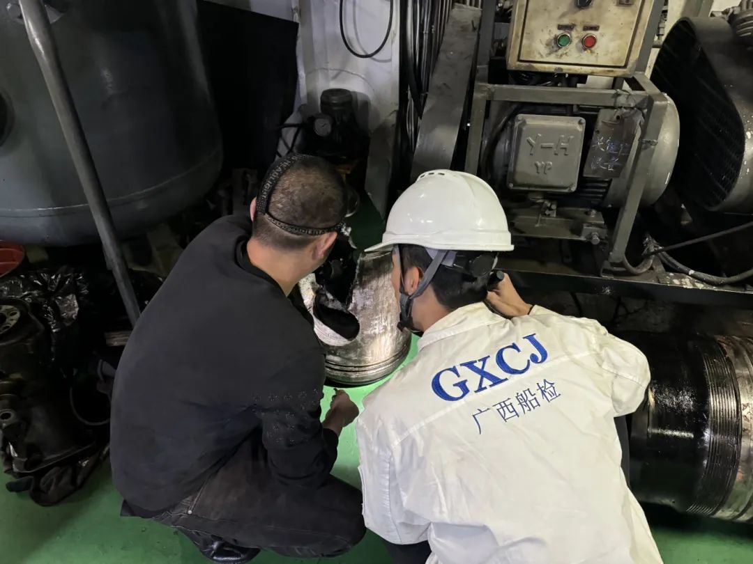 北海船舶检验中心验船师与船员分析船舶主机故障原因。