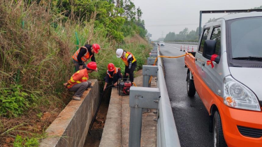 协同配合,多方参与救援 在现场应急救援指挥部的指导下,钦州市、灵山县应急管理、生态环境、交通运输、交警、消防等部门与有关专家现场研究对策,多方联动,紧密配合开展救援行动。 现场还投入无人机参与救援,通过航拍了解事故整体情况,给救援提供参考方案。利用车载LED信息显示屏、声光路锥、车载扩音器及人工摇旗等方式,提醒过往车辆绕行,防止后续来车冲入事故区域。同时根据应急部门指示立即关闭灵山收费站入口,确保事故现场有序施救。 经多方密切协同配合,危险事故得以快速排除,事故车辆最终拖离现场,受伤人员及时就医,高速公路及收费站恢复正常通行。 针对事故路面存在柴油泄漏的情况,该分公司组织人员配合环境监察部门清洗受柴油污染的路面,并使用抽水泵抽取泄漏到路边排水沟的污染物,防止污染扩散。 文字|杨东 兰定 图片|张怡琦