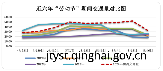 根据省公路局和省高速公路运营管理有限公司提供的历年数据分析,近六年“劳动节”期间我省公路交通量呈增长趋势,交通量分布呈现“西宁周边大、海西青南地区小”的特征,其中交通量较大收费站分别为G6京藏高速海东主线收费站、西宁西主线收费站,G0612西和高速海东西主线收费站。2021年“劳动节”期间日交通量为38.81万辆;2022年“劳动节”期间日交通量为22.89万辆,2023年“劳动节”期间日交通量为45.49万辆;2024年“劳动节”预计交通量同比增加5%左右,达到50万辆/日。5月5日(假期第五日)通往西宁道路交通量可能出现局部高峰,5月6日(假期后一日)交通量将回落。