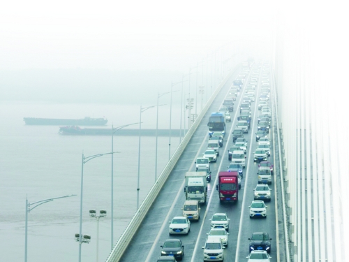 5日,南京江心洲长江大桥迎来返程车流高峰 杜懿 摄 视觉江苏网供图